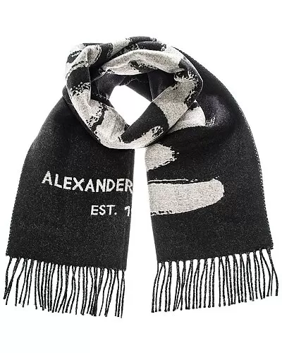 - Graffiti Print Wool Scarf in black and grey with oversize Graffiti logo with 3in fringe at both ends