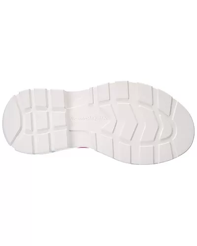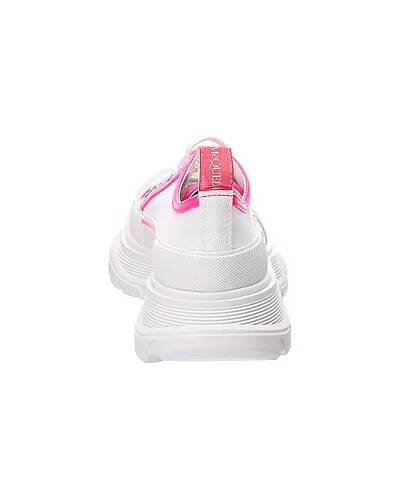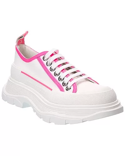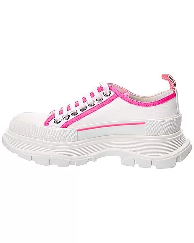 - Tread Slick Canvas & Leather Sneaker in white canvas and neon pink leather and silver-tone hardware with rubber toe and chunky sole