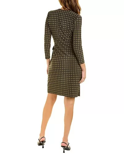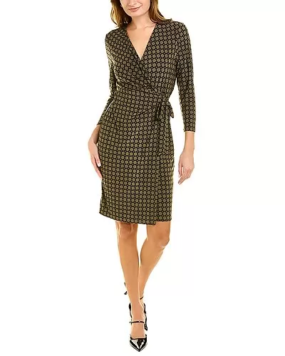 - Geometric Print Dress in green and black combo with faux wrap design, tie at waist, and plunging V-neck