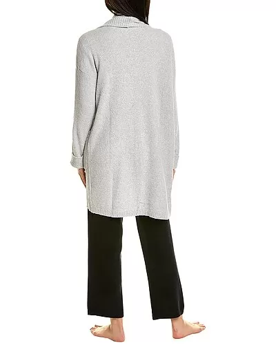 - Aura Ribbed Cardigan in heather dove grey with soft plush design, ribbed shawl collar, two front pockets, and tie-sash at waist