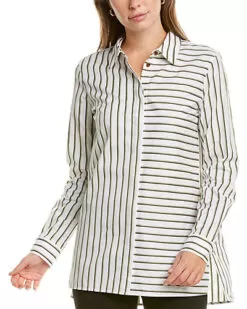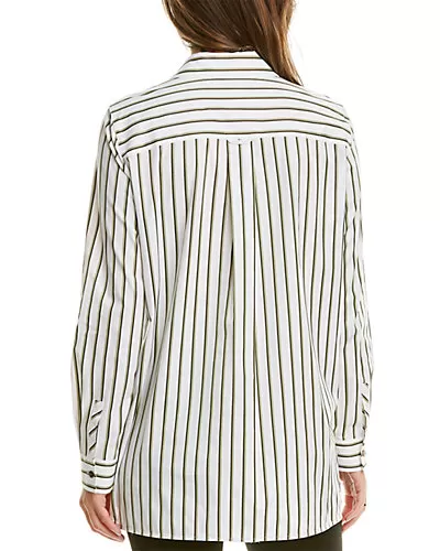 - Bray Blouse in soft mint multicolor with pointed collar, barrel cuffs, box pleat at back, and high-low hem