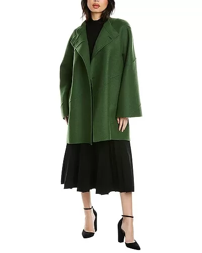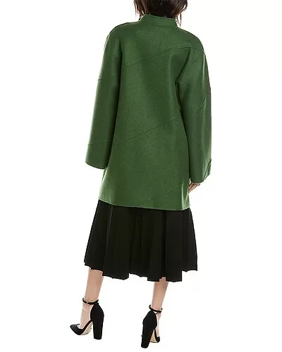 - Wool-Blend Wide Sleeve Oversize Coat in fern green with high neck, dual side seam pockets, and topstitching accents