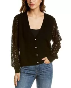 - Lace Sleeve Wool-Blend Cardigan in black with V-neck, sheer lace sleeves and pearl buttons