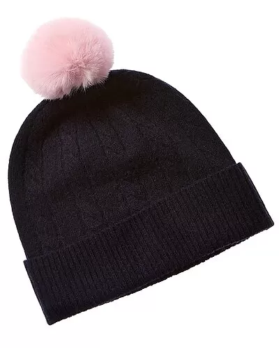 - Contrast Pom Cable Cashmere Hat in navy multicolor with faux fur pom and rolled hem