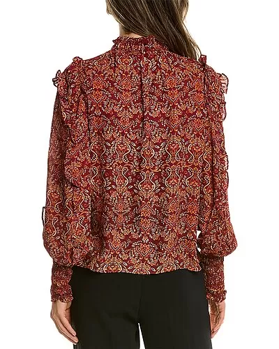 - Crepe Blouse in wine leafy paisley with smocked mock neck and cuffs and ruffle trim