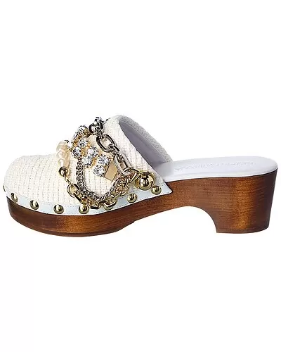 - Bejeweled Chain Raffia Mule in white raffia and gold-tone and silver-tone hardware with embellished chain detailing and stud embellishments