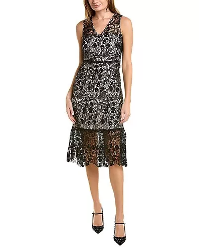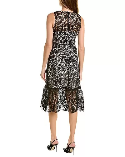 - Lace Midi Dress in black and nude combo with lace overlay and ruffle hem
