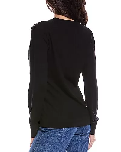 - Evangeline Wool-Blend Sweater in black/black with V-neck, bead and sequin embellishments and ribbed trim