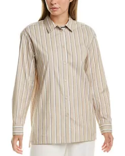 - Everson Blouse in papyrus stripe with barrel cuffs, box pleat at back, and high-low hem with side slits