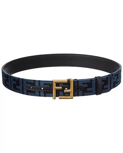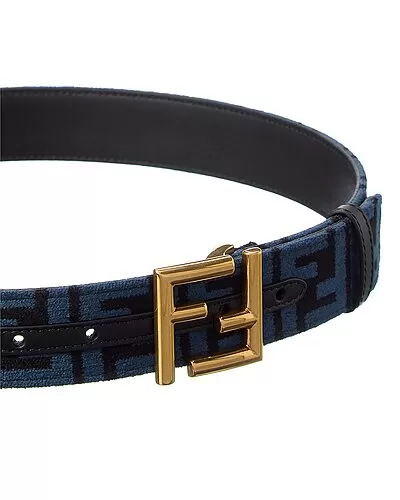 - FF Logo Buckle Leather-Trim Belt in navy blue FF tapestry chenille and leather with gold-tone hardware and pin buckle closure