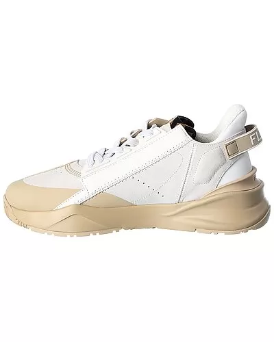 - Flow Suede Sneaker in white and brown suede and silver-tone hardware with logo back strap and zipper accent