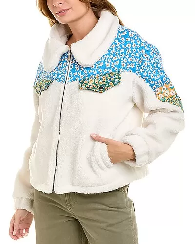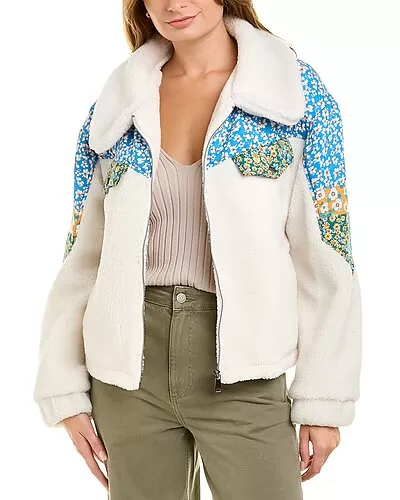 - Floral Teddy Jacket in ivory with spread collar, dual chest pockets, dual front pockets, dropped-shoulder sleeves, and elasticized cuffs