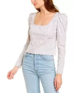 - Caroline Stripe Top in neutral combo with scoop neck and pleated shoulders