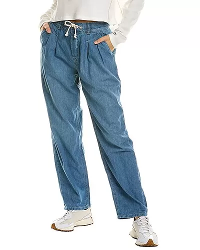 - Luna Denim Pull-On Pant in blue with elasticized drawstring waist, pleated front, and four-pocket styling