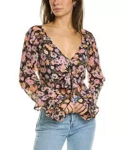 - Maybel Blouse in black multicolor with self-tie center bust and flounce cuffs