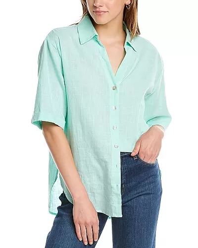 - Design details: spread collar, rolled cuffs and high-low shirttail hem