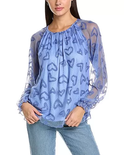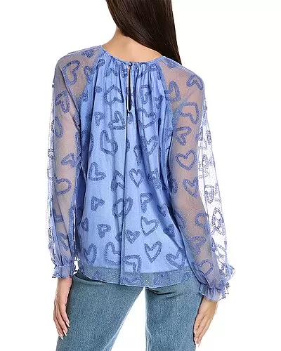 - Freya Top in hydrangea with embroidered mesh design, shirred neck, sheer sleeves, and elasticized cuffs