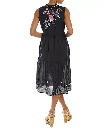 - Phoebe Tank Dress in granite blue with embroidered design, V-neck, mock collar, dual side on-seam pockets, and tiered skirt