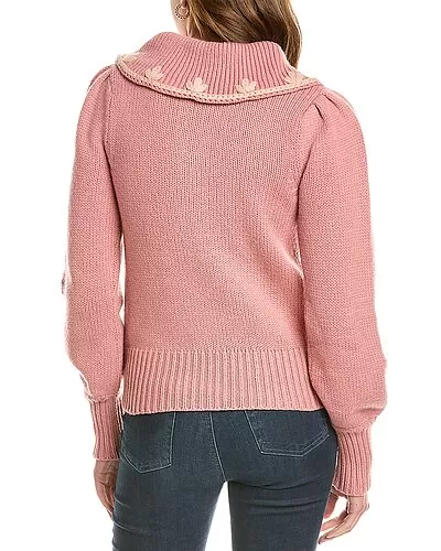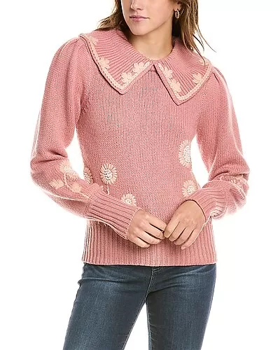 - Union Wool-Blend Top in rose blush with knit design, floral embroidery, oversized collar, shirred shoulders, and ribbed trim