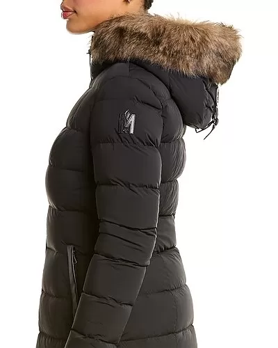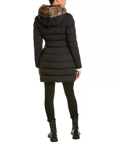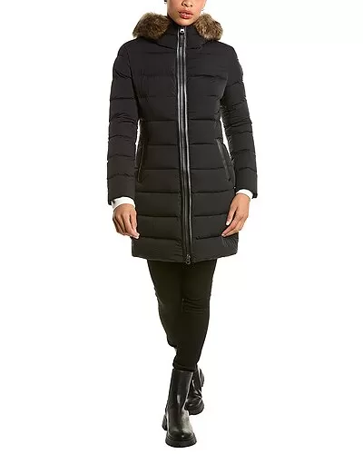 - Calla Leather-Trim Down Coat in black with puffed design, attached hood with fur trim, dual front zippered pockets with leather trim, and inner left zippered pocket
