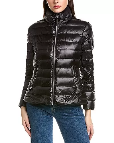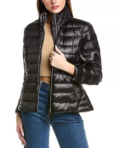 - Davina Short Down Jacket in black with quilted design, stand-up collar, hidden hood, and two zippered front pockets