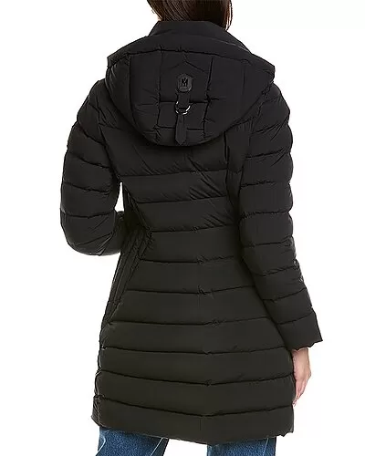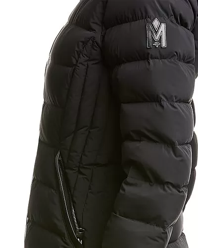- Design details: puffed design, mock collar, removable drawstring hood, dual front zippered pockets, leather trim