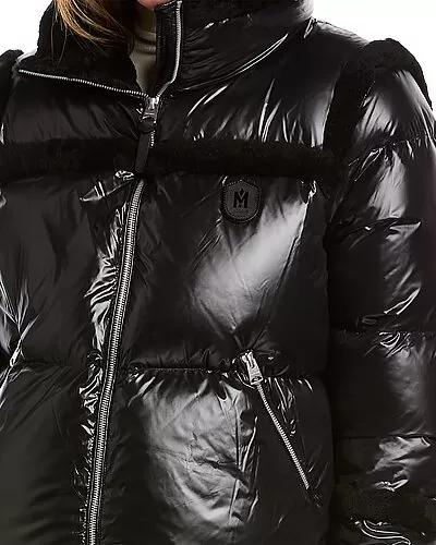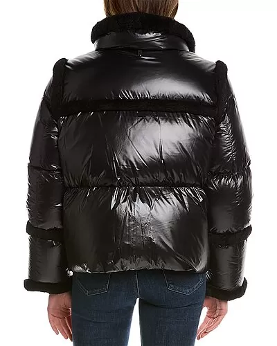 - Miya Shearling-Trim Puffer Jacket in black with quilted design, shearling trim and two front zippered pockets