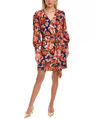 - Midi Wrap Dress in navy floral with plunge neck, button accents, bubble sleeve, belted waist, and barrel cuff