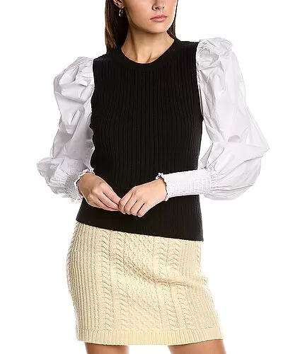 - Mixed Media Sweater in black combo with contrast sleeves, pleated shoulders, and smocked cuffs