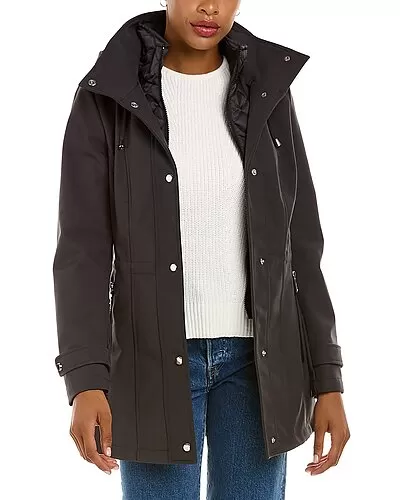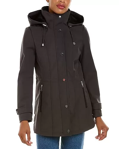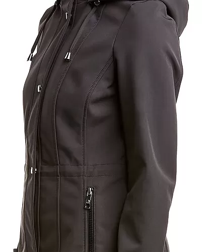 - Design details: stand collar, detachable fleece-lined hood, two front zippered pocket, strap detail at cuffs and snap details at hem