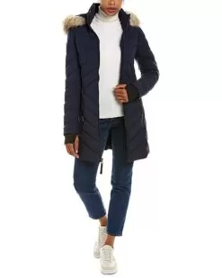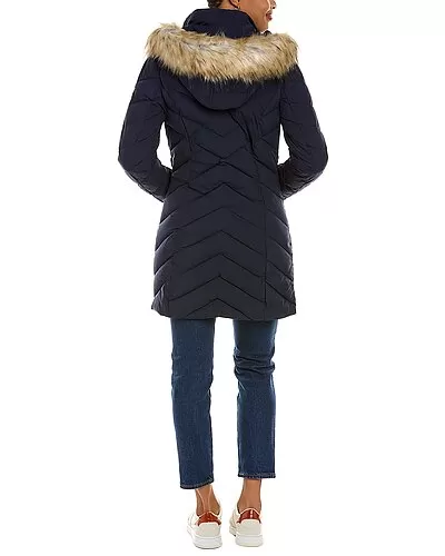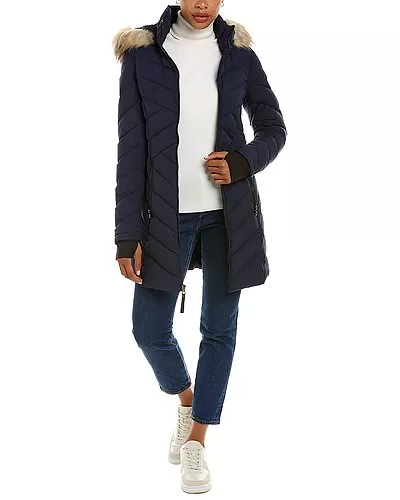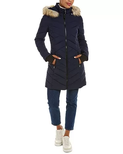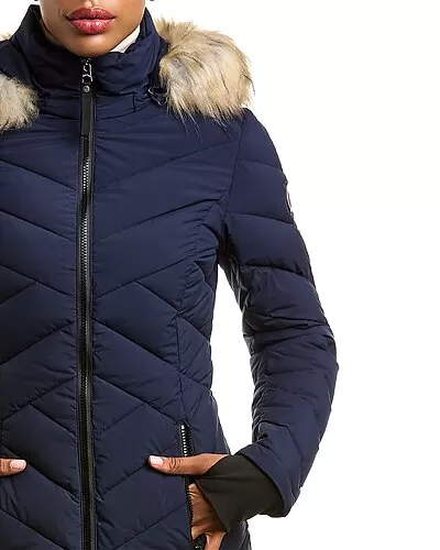 - Design details: puffer style, removable drawstring hood, faux fur trim, dual front zip pockets, and thumb holes at cuffs