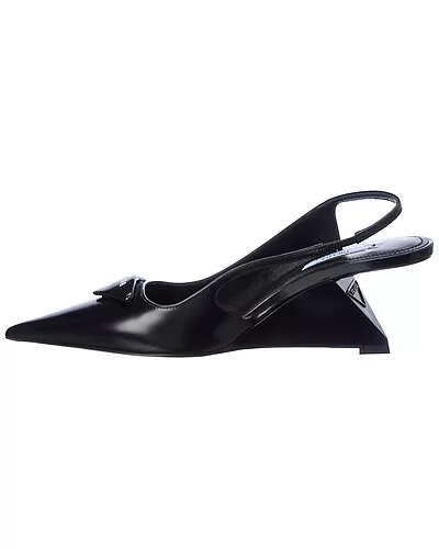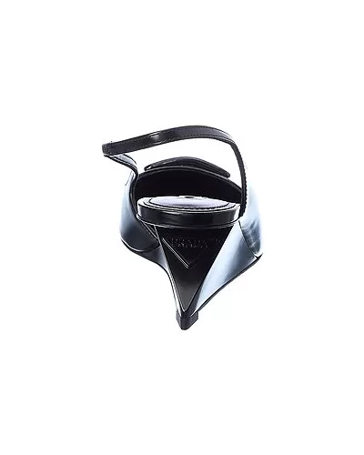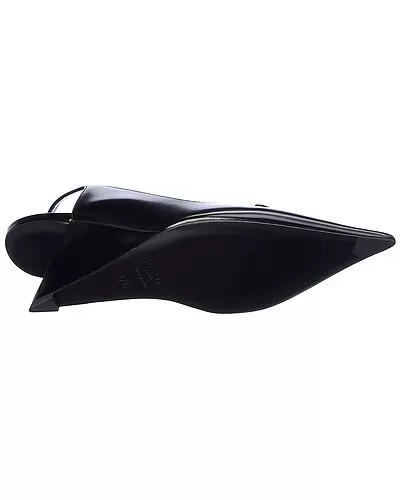 - Brushed Leather Pointy-Toe Slingback Pump in black leather with logo accent and angled heel