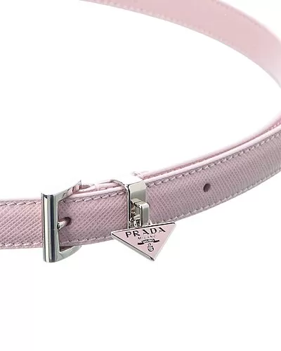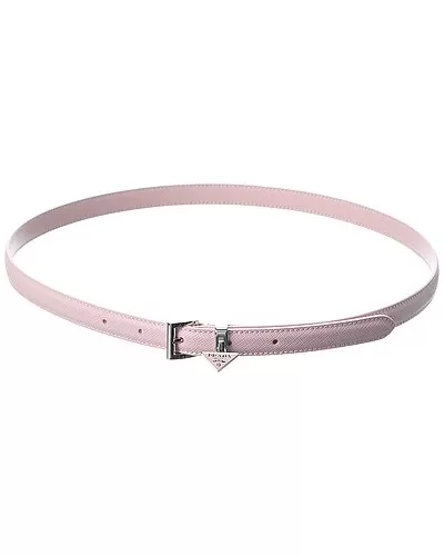 - Logo Charm Saffiano Leather Belt in pink saffiano leather and steel finish hardware with triangle logo charm and pin buckle closure