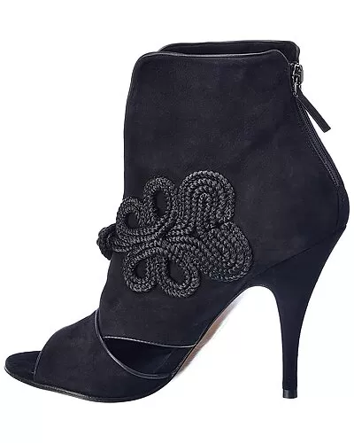 - Amirah Suede Bootie in black suede and silver-tone hardware with rope applique and open toe