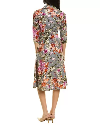 - Abel Shirtdress in millie fruit toile soft grey with 3/4-length sleeves, side slip pockets, belted waist, and removable tie-sash