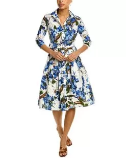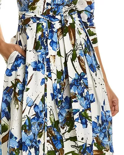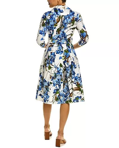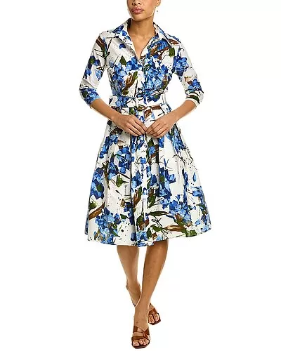 - Audrey 1 Shirtdress in flower p white blue with 3/4-length sleeves, pleated skirt, side seam pockets, belted waist, and tie-sash