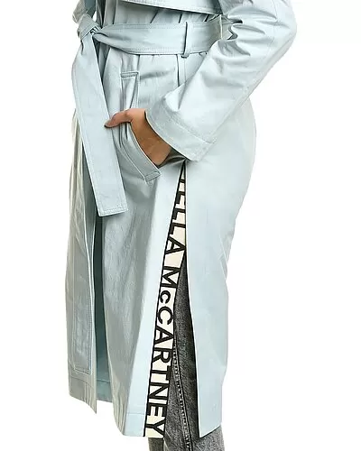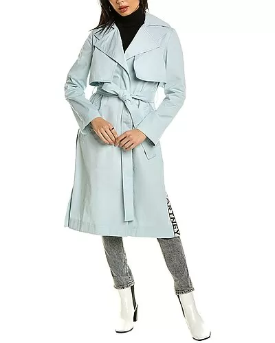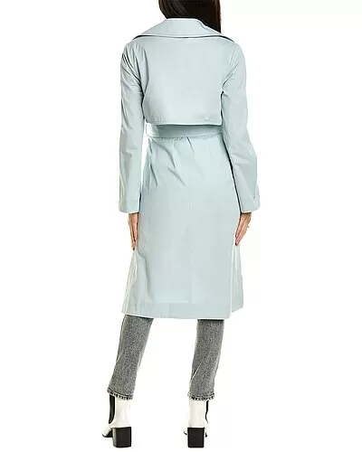 - Melinda Trench Coat in blue with notch collar, storm flaps, dual front pockets, belted waist, and vented sides