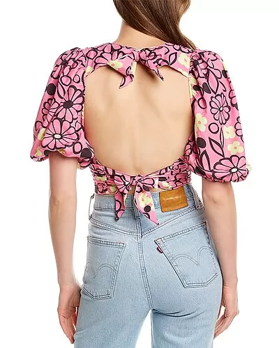 - Design details: plunging neckline, puff sleeves, pleated hem and open back with self-tie closures