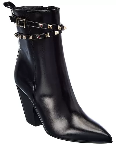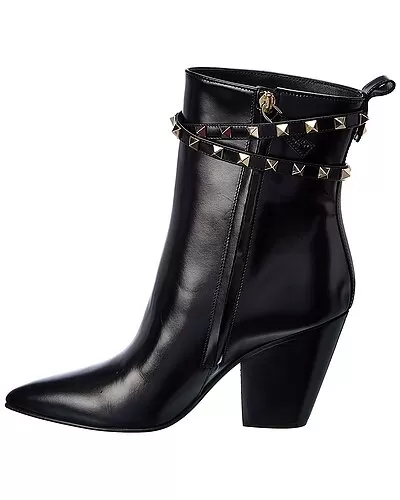 - Rockstud 85 Leather Bootie in black leather with wrap around strap with platinum-finish rockstuds