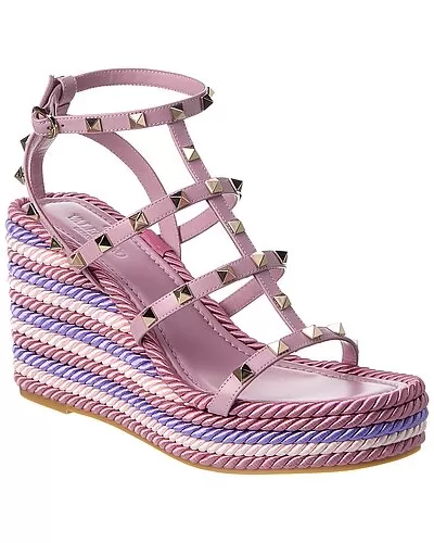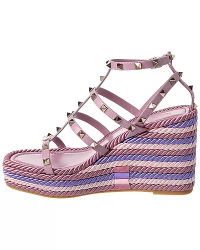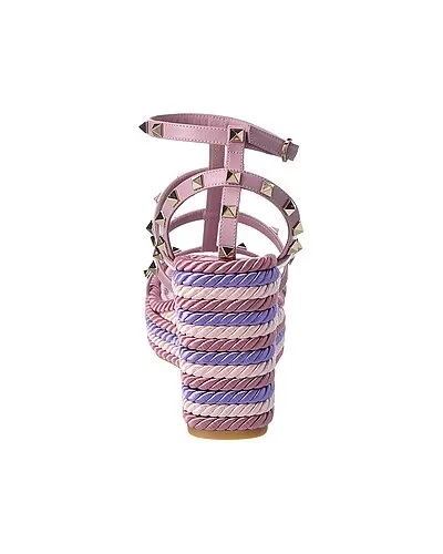 - Rockstud 95 Rope & Leather Wedge Sandal in pink braided rope and leather with platinum-finish rockstuds