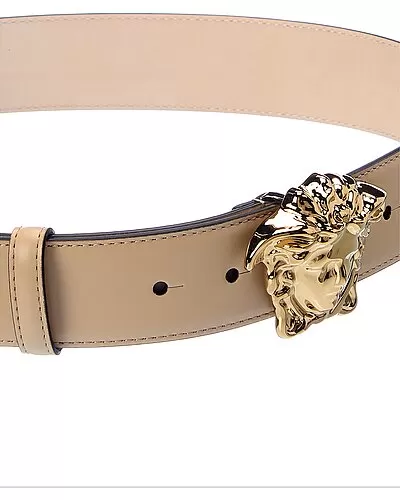 - Medusa Buckle Leather Belt in brown leather with gold-tone hardware, Medusa head logo buckle and pin buckle closure